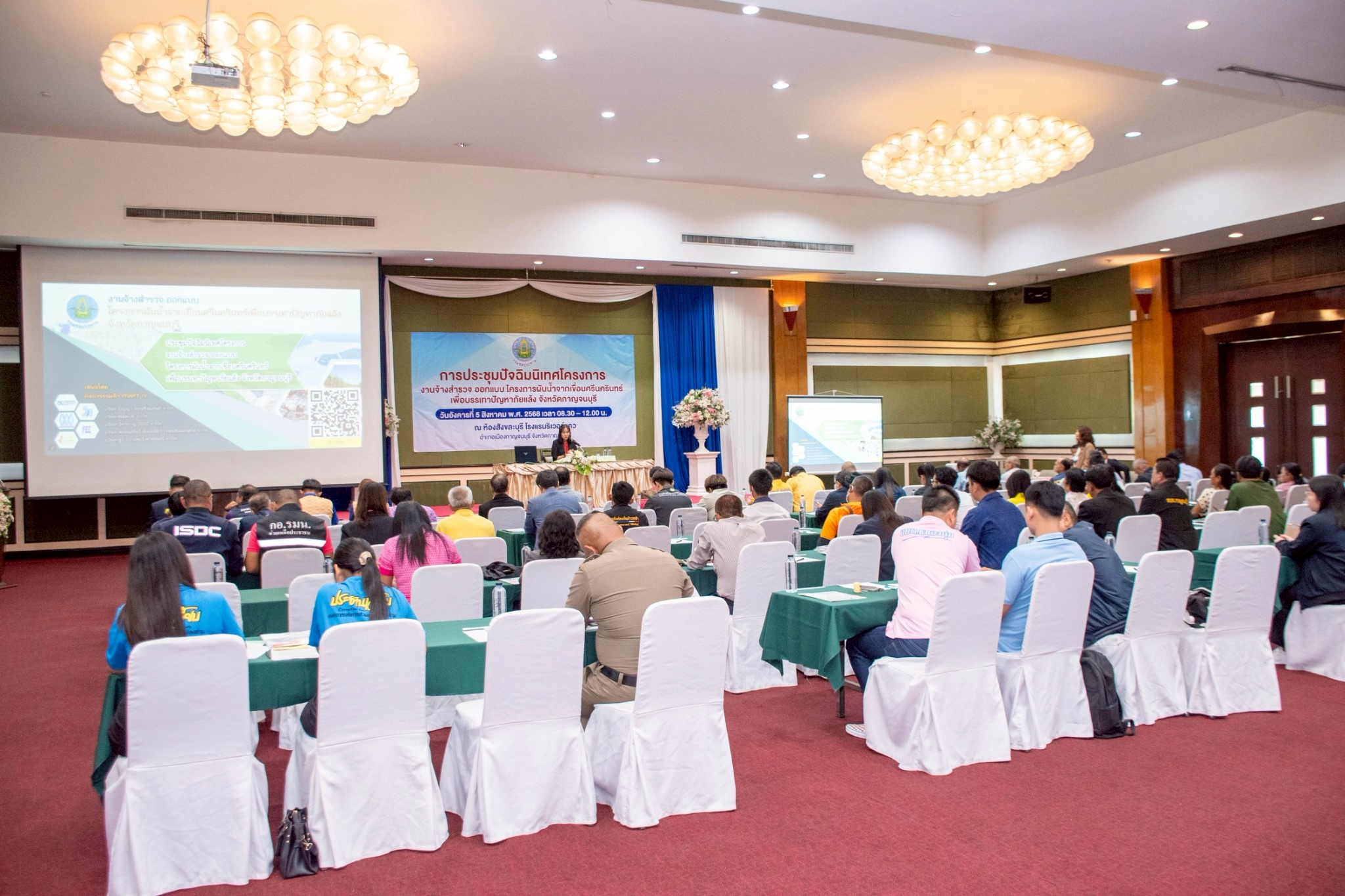 กรมชลประทาน ร่วมกับ กิจการร่วมค้า PFWFT JV ได้จัดให้มีการปัจฉิมนิเทศโครงการ งานจ้างสำรวจ ออกแบบ โครงการผันน้ำจากเขื่อนศรีนครินทร์เพื่อบรรเทาปัญหาภัยแล้ง จังหวัดกาญจนบุรี เมื่อวันอังคารที่ 5 สิงหาคม พ.ศ. 2568 ณ ห้องสังขละบุรี โรงแรมริเวอร์แคว อำเภอเมือง จังหวัดกาญจบุรี เพื่อนำเสนอสรุปผลการออกแบบรายละเอียดโครงการให้หน่วยงานที่เกี่ยวข้องและประชาชนผู้ได้รับผลกระทบ พร้อมทั้งร่วมแลกเปลี่ยนข้อคิดเห็นและข้อเสนอแนะต่างๆ โดยได้รับเกียรติจาก นางสาวสุมณฑา มณเทียร เกษตรและสหกรณ์จังหวัดกาญจนบุรี กล่าวต้อนรับและเปิดการสัมมนา และนายธีระชัย เนียมหลวง ผู้เชี่ยวชาญด้านวิศวกรรมโยธา (ด้านออกแบบและคำนวณ) กล่าวรายงาน มีผู้เข้าร่วมประชุม 120 คน