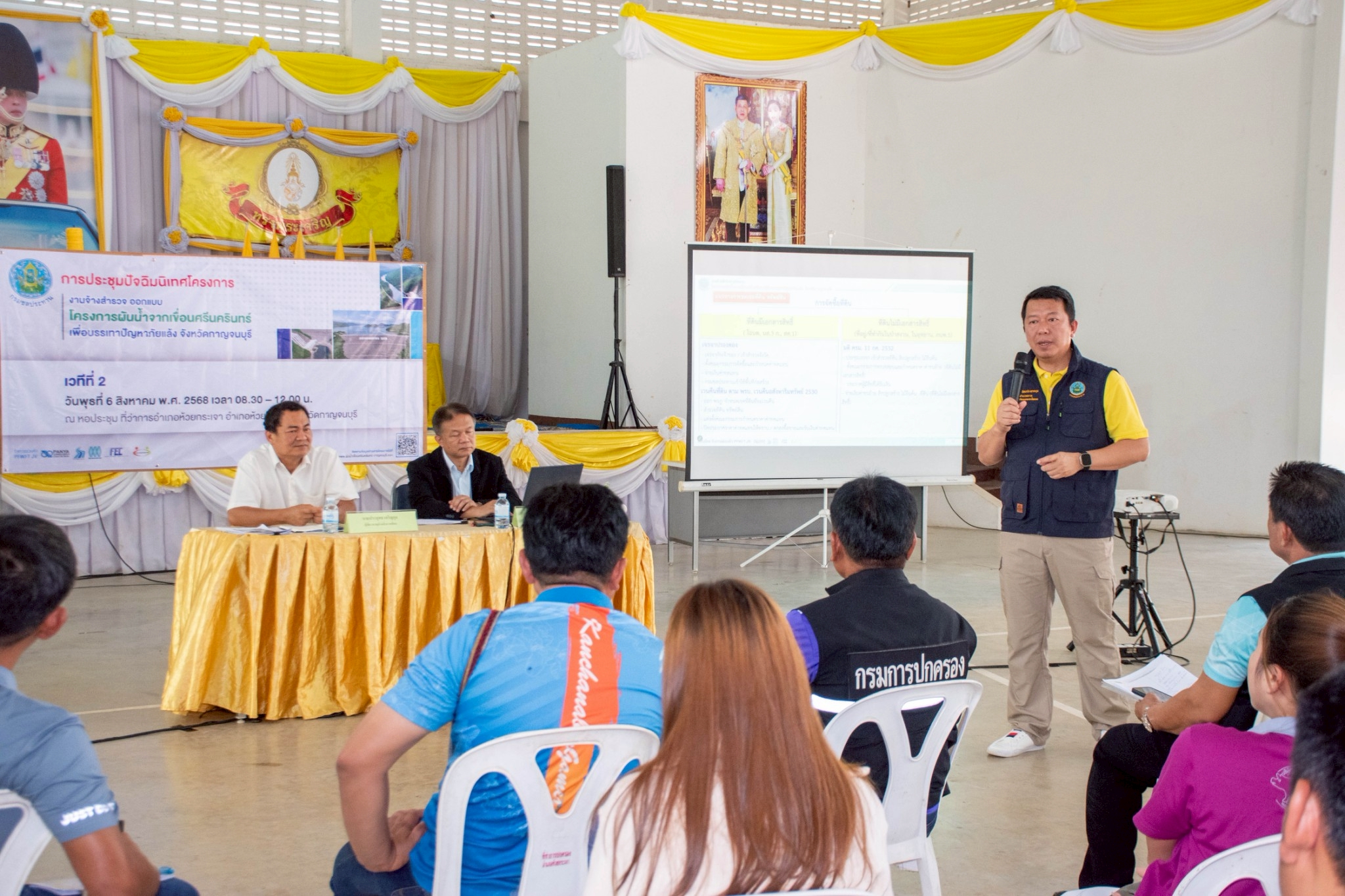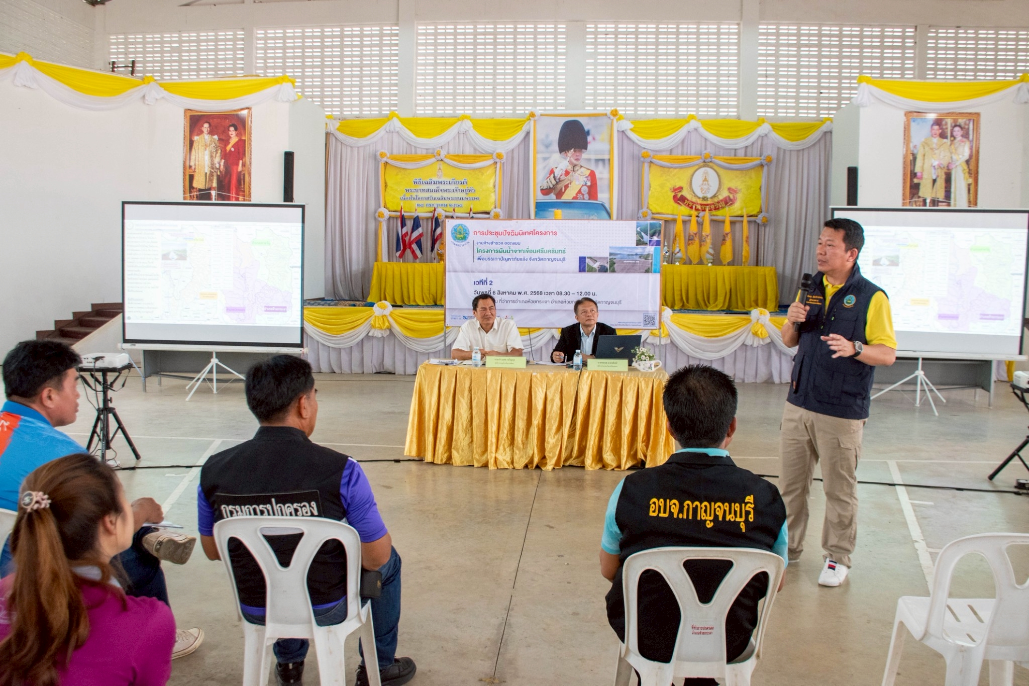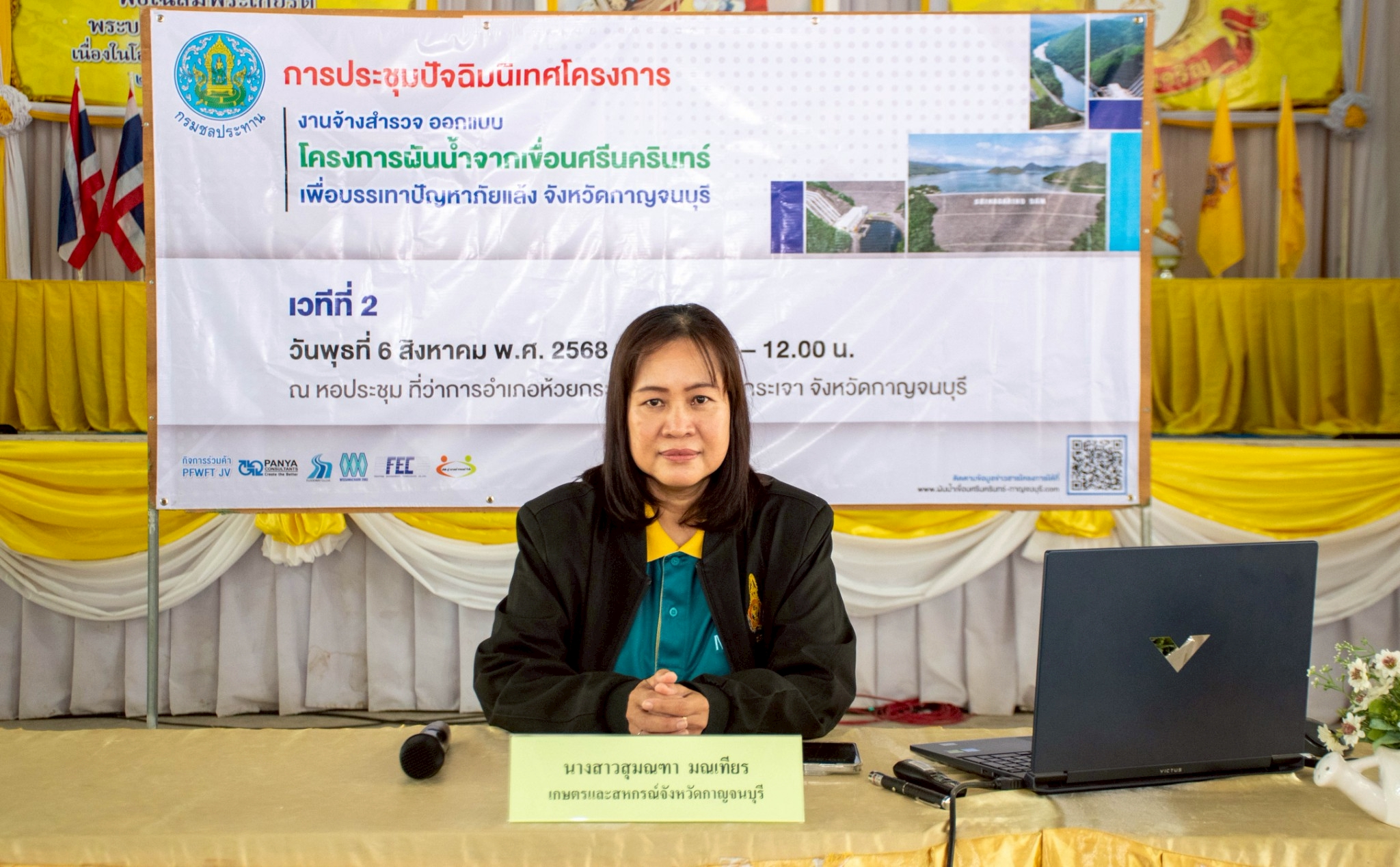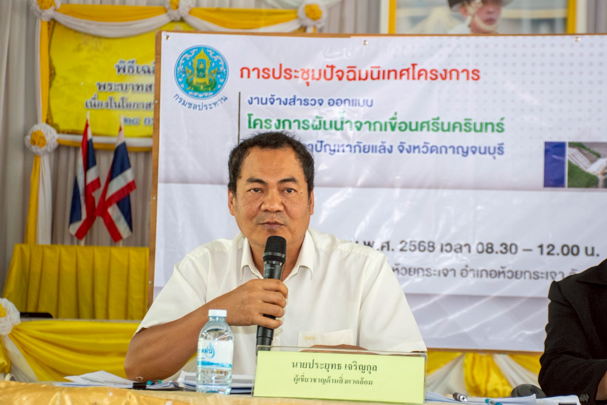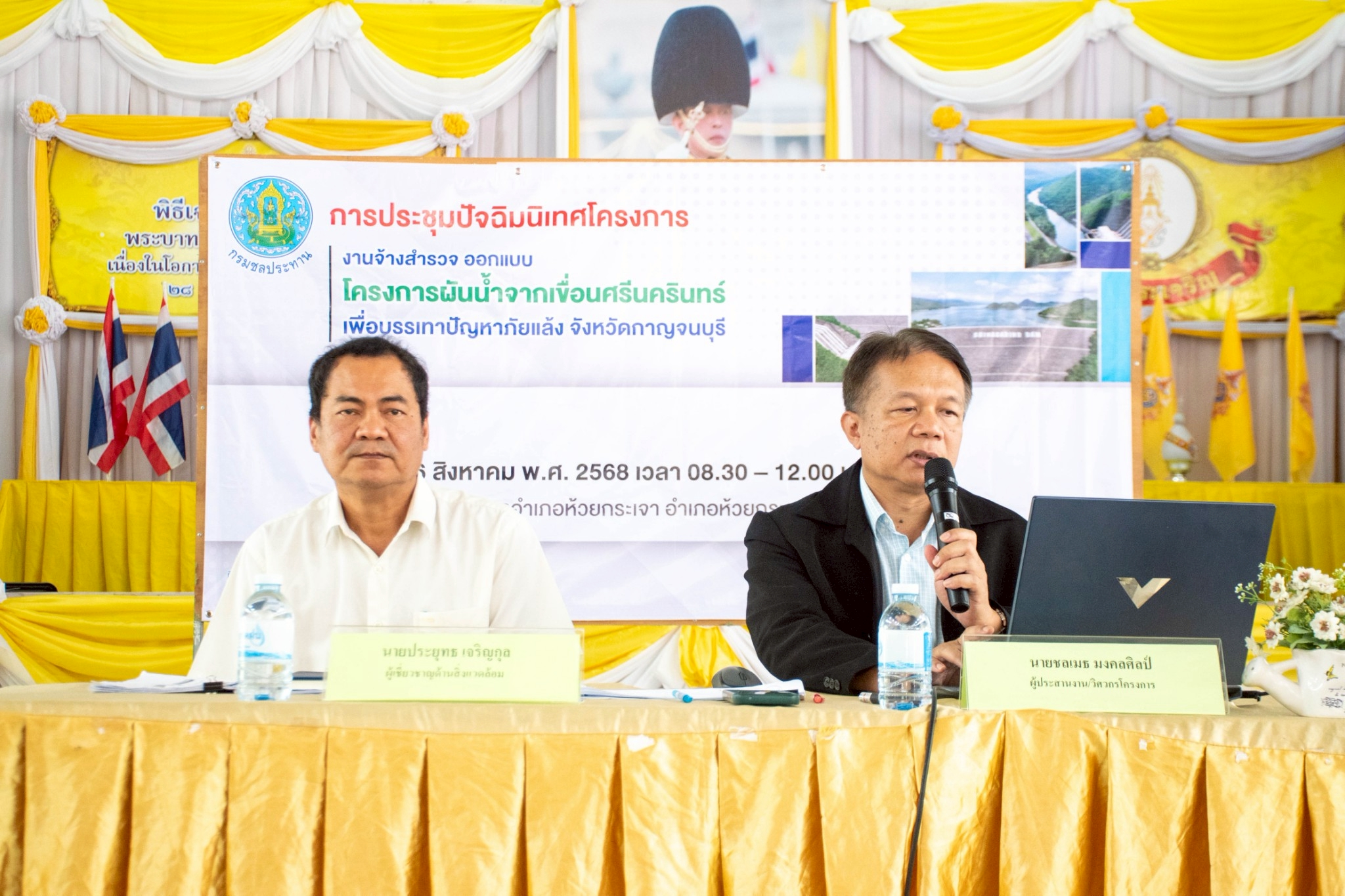 กรมชลประทาน ร่วมกับ กิจการร่วมค้า PFWFT JV ได้จัดให้มีการปัจฉิมนิเทศโครงการ งานจ้างสำรวจ ออกแบบ โครงการผันน้ำจากเขื่อนศรีนครินทร์เพื่อบรรเทาปัญหาภัยแล้ง จังหวัดกาญจนบุรี เมื่อวันพุธที่ 6 สิงหาคม พ.ศ. 2568 ณ หอประชุม ที่ว่าการอำเภอห้วยกระเจา อำเภอห้วยกระเจา จังหวัดกาญจบุรี เพื่อนำเสนอสรุปผลการออกแบบรายละเอียดโครงการให้หน่วยงานที่เกี่ยวข้องและประชาชนผู้ได้รับผลกระทบ พร้อมทั้งร่วมแลกเปลี่ยนข้อคิดเห็นและข้อเสนอแนะต่างๆ  โดยได้รับเกียรติจาก นางสาวสุมณฑา มณเทียร เกษตรและสหกรณ์จังหวัดกาญจนบุรี กล่าวต้อนรับและเปิดการสัมมนา และนายธีระชัย  เนียมหลวง ผู้เชี่ยวชาญด้านวิศวกรรมโยธา (ด้านออกแบบและคำนวณ) กล่าวรายงาน มีผู้เข้าร่วมประชุม 100 คน